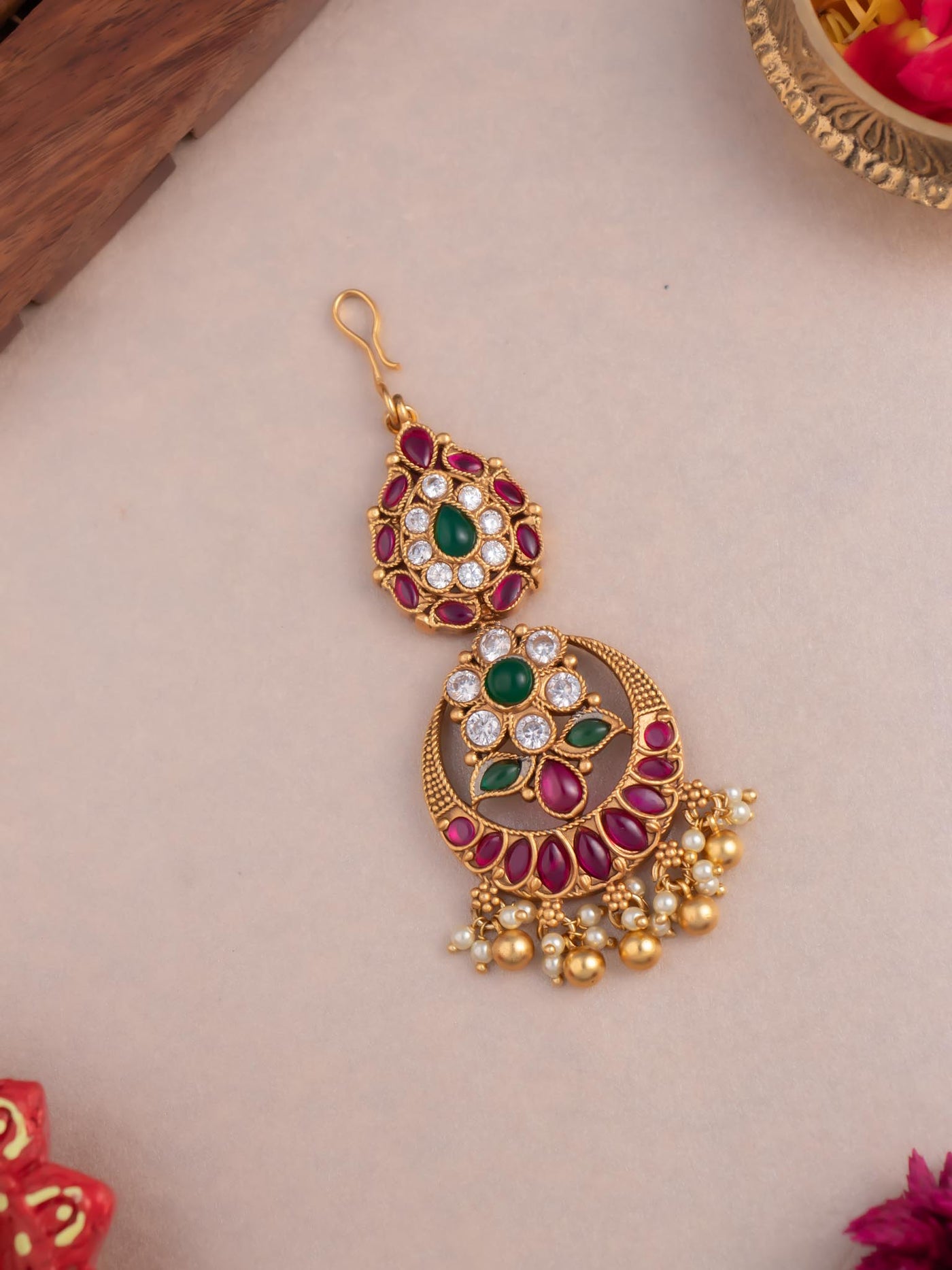 A beautiful handcrafted  antique Kemp maang tikka for our royal queens! Enhance your bridal look with this unique design tikka. This piece is specially crafted from gold-plated brass, kemp stones with Gold and Pearl hangings