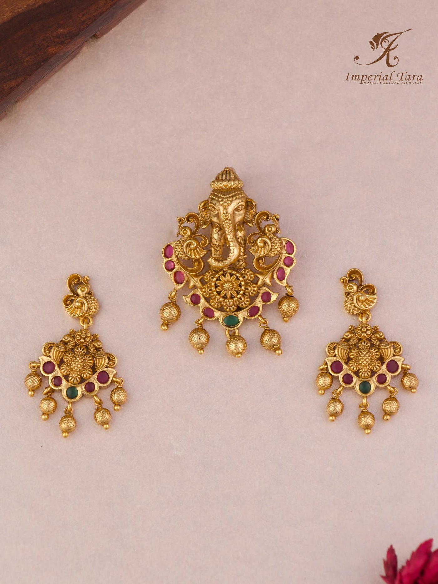 Gold finish lord Ganesh pendant set with pair of earrings. shop now at imperial tara